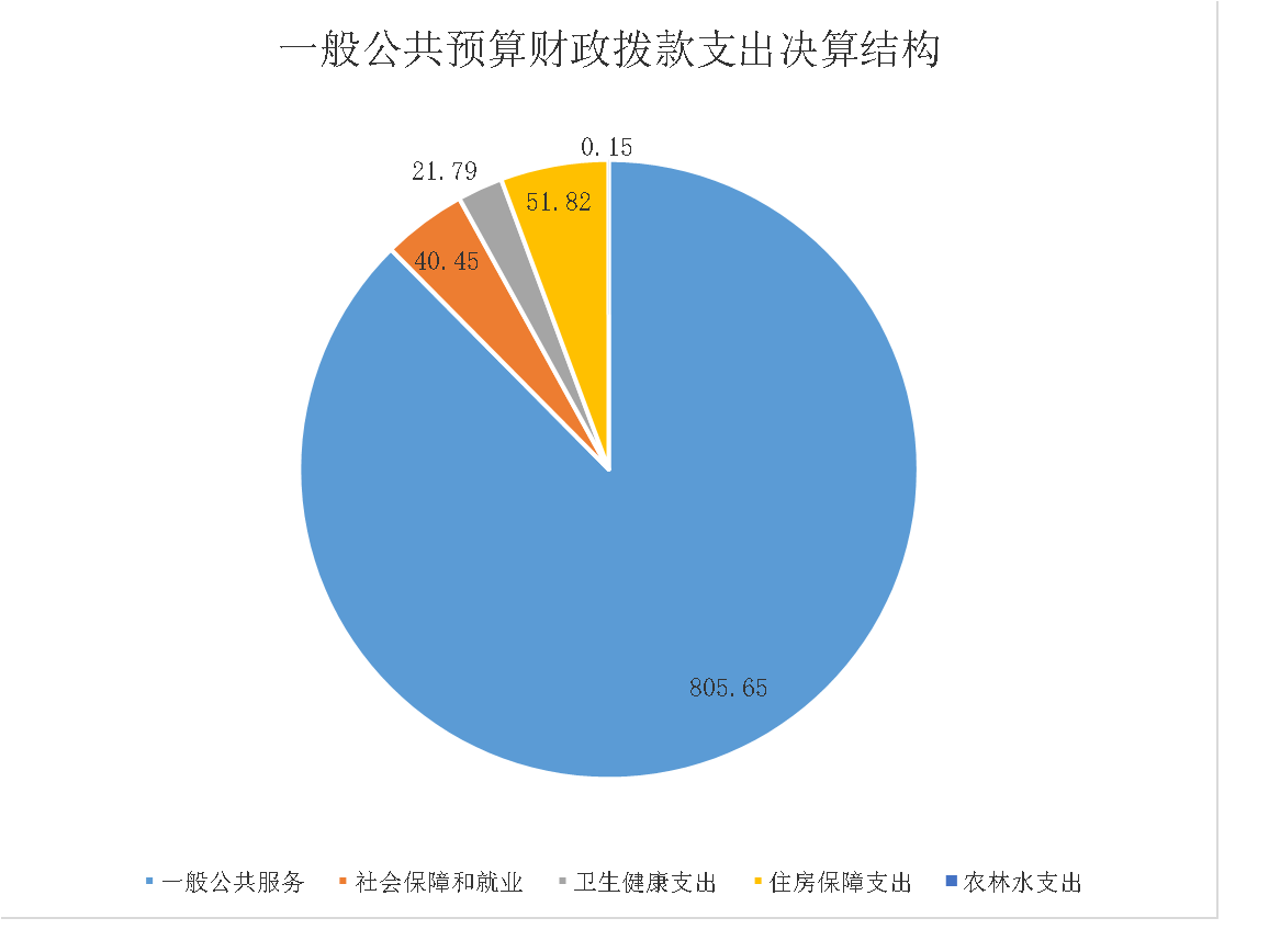 2021年一般公共预算财政拨款支出919.86万元,主要用于以下方面:一般公共服务(类)支出805.65万元,占87.58%;社会保障和就业(类)支出40.45万元,占4.4%;卫生健康支出21.79万元,占2.37%;农林水支出0.15万元,占0.02%;住房保障支出51.82万元,占5.63%。
